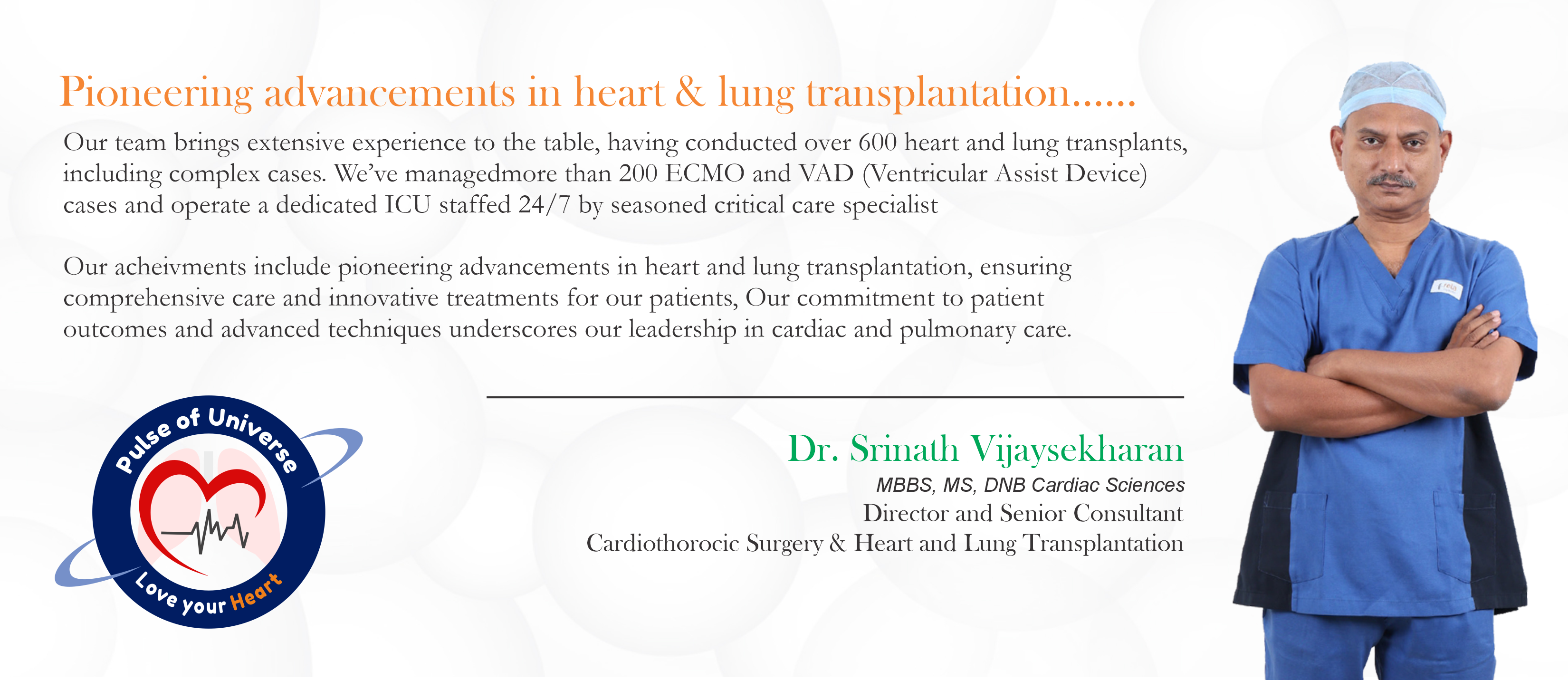 PULSE OF UNIVERSE offers world-class heart and lung treatments, specializing in advanced transplant surgeries, minimally invasive cardiac procedures, and critical care support. Our compassionate team is committed to providing personalized care for heart failure, lung disorders, and complex cardiothoracic conditions.